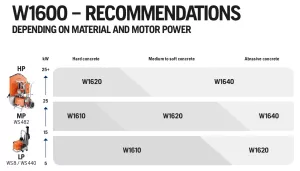 Serija W1610 je na voljo v različnih premerih od 600 mm do impresivnih 1600 mm, kar omogoča uporabo za raznovrstne aplikacije. Rezila so na voljo z različnimi širinami segmentov (od 3,8 mm do 5 mm) in z različnimi vzorci lukenj za vpetje (PL3012 in PL70061), kar zagotavlja kompatibilnost z različnimi stroji.